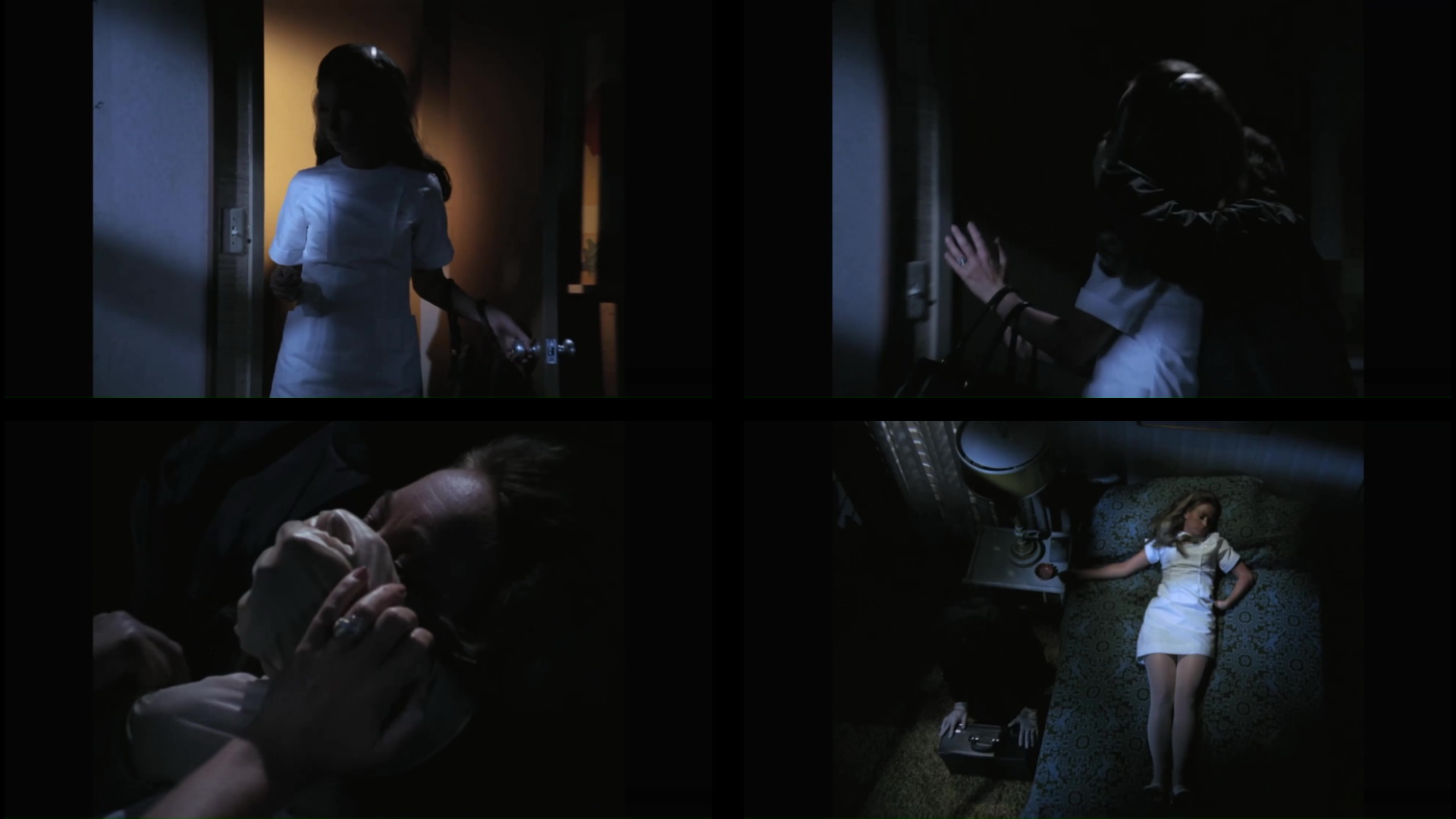 An unknown actress playing a Nurse is hand-over-mouth (HOM) suffocated upon returning home from work. The killer then carries her to her bedroom, lays her on her bed, puts makeup on her, and leaves her posed corpse to be found later.